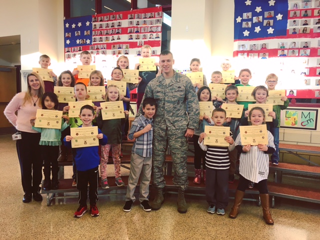Mrs. Ahern's 2nd grade classroom sent letters to some Air Force soldiers who were stationed overseas around Christmas time. One of the soldiers who received the letters is the dad of Mason Peterson, a student in Mrs. Ahern's room. Branden Peterson TSgt, USAF was stationed in the Middle East until he recently returned home in January. The unit was greatly touched by the students' letters and wanted to send something back as a Thank You. The classroom received a Certificate of Appreciation and a special coin from the 332nd Exp Security Forces Squadron. Copies of the certificate were printed out for each of the students, and they were fortunate enough to have Mr. Peterson come in for questions and a photo after he returned from his deployment.