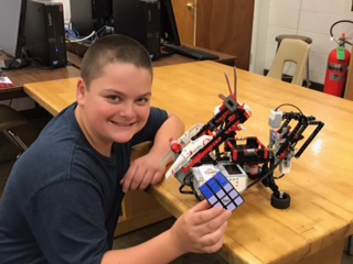 Mrs. Beisel chose students in her class who were innovative and asked them to develop a line following car using Legos. John was assigned the role of being the leader.Once the students assembled the robotic vehicle, they began working on constructing a replica of a city utilizing cardboard and foam.John then wrote a program forcing the car to drive through the city following a line.