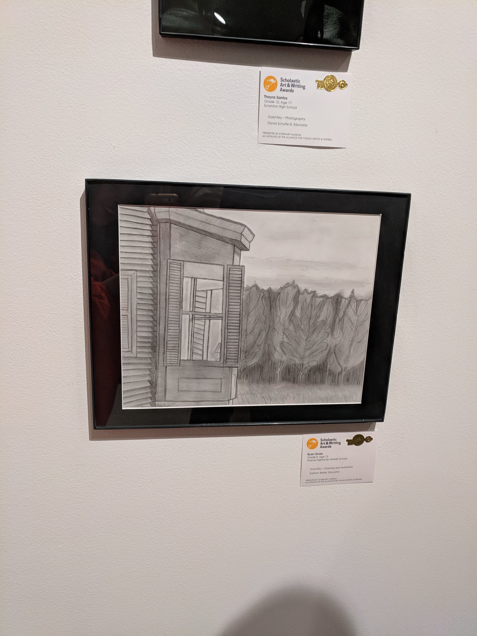 Area middle school students from Wayne Highlands Middles School are about to join this list!Ryan Gross, Claragail Wheeler, Brayden Kopesky, Arianna Watson, and Skye Skinner (all grade 8) were honored at the Awards Ceremony on Saturday.Skye and Ryan earned Honorable mentions for their drawing and sculpture.Arianna earned a Silver Key for her Mixed Media Dreamcatcher. Claragail, Brayden, and Ryan earned Gold Keys for their sculpture, photography, and drawings which, because of their Gold Key status, are currently on display at the Everhart Museum.The artwork will remain for the month of February before returning to WHMS.