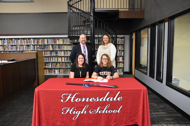 Corinne Wohlmaker of Honesdale has announced that she will be continuing her academic and athletic career at the NCAA level in field hockey at Keystone College. Corinne is pictured here with Coach Carly Propst. Also on hand for this National Letter of Intent signing were High school principal Chris Pietraszewski, and athletic director Diane Scarfalloto.