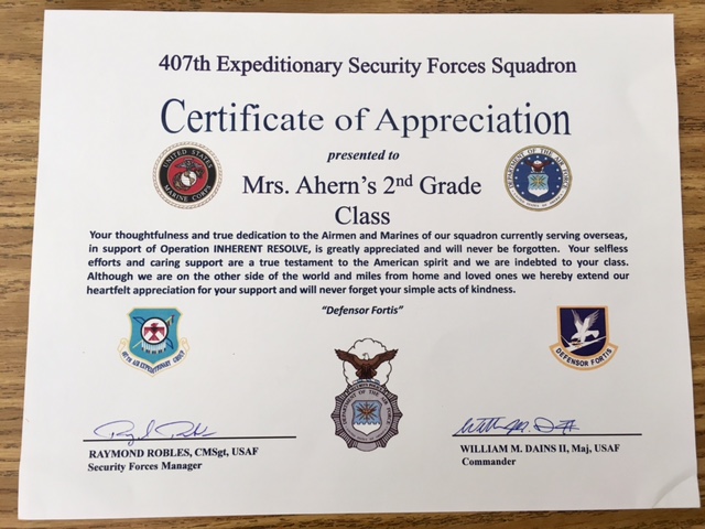 Mrs. Ahern's 2nd grade classroom sent letters to some Air Force soldiers who were stationed overseas around Christmas time. One of the soldiers who received the letters is the dad of Mason Peterson, a student in Mrs. Ahern's room. Branden Peterson TSgt, USAF was stationed in the Middle East until he recently returned home in January. The unit was greatly touched by the students' letters and wanted to send something back as a Thank You. The classroom received a Certificate of Appreciation and a special coin from the 332nd Exp Security Forces Squadron. Copies of the certificate were printed out for each of the students, and they were fortunate enough to have Mr. Peterson come in for questions and a photo after he returned from his deployment.