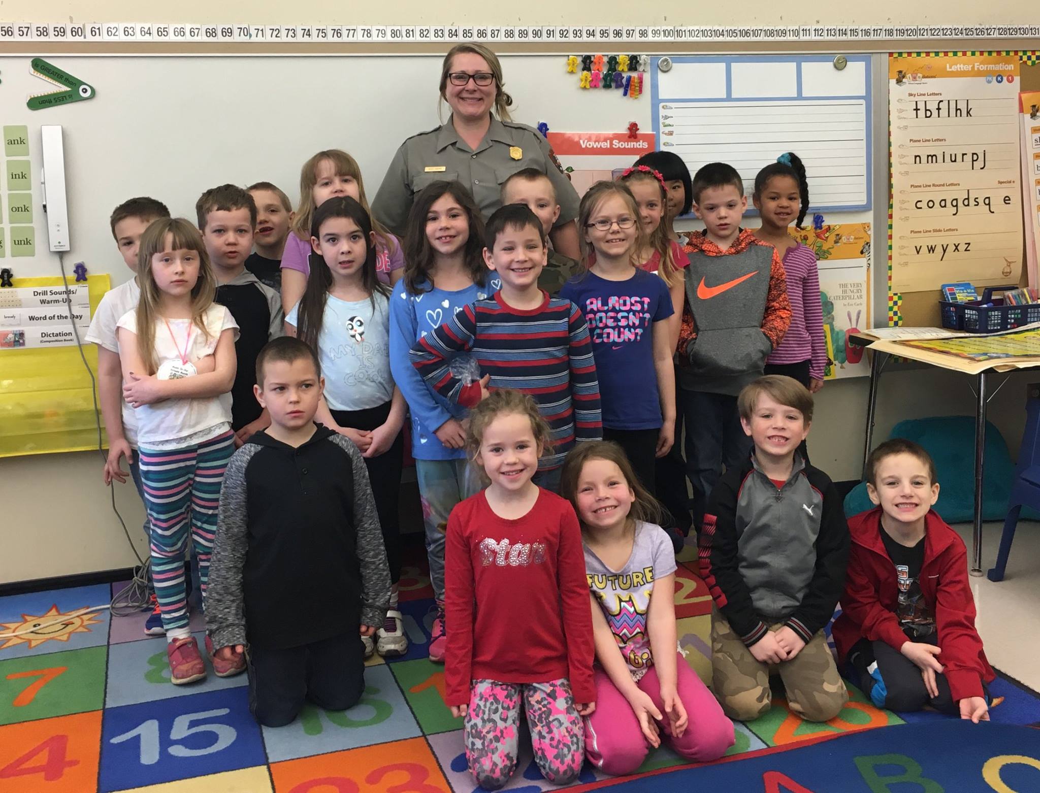 Students at Stourbridge Primary Center have been watching a live video feed of a bald eagle nest in Hanover, PA. They were able to watch the pair of eagles lay eggs, watch the eggs hatch, and are currently watching the two baby eagles grow up. These first graders received an exciting visit from a special guest. Park Ranger with the National Park Service, Upper Delaware Scenic and Recreational River, Susie Kaspar paid a visit to talk about the importance of our national bird. Ranger Kaspar shared photos, replica models, real bald eagle feathers, and tips about how to help our environment.